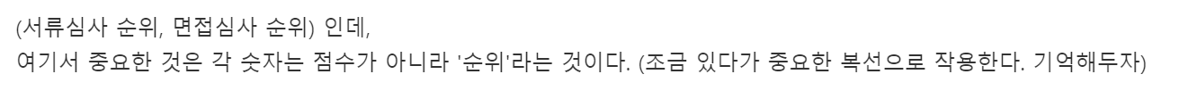 문제가 어려울 수도 있는데, 최종합격자들은 다른 합격자들에 비해서 면접점수나 서류점수 하나는 높아야 된다는 것이다.