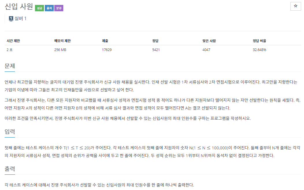 시간 제한 2초임에도 불구하고 테스트 케이스가 최대 20개, 각 지원자 수가 10만이기때문에 (곱하면 200만개의 입력을 받아야 된다는 것이다!)