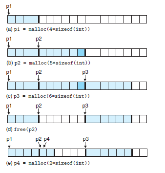 C언어 표준 라이브러리는 malloc 이라는 명시적인 할당기를 많이 쓴다. 이 함수로 힙으로부터 블록들을 할당받는다.