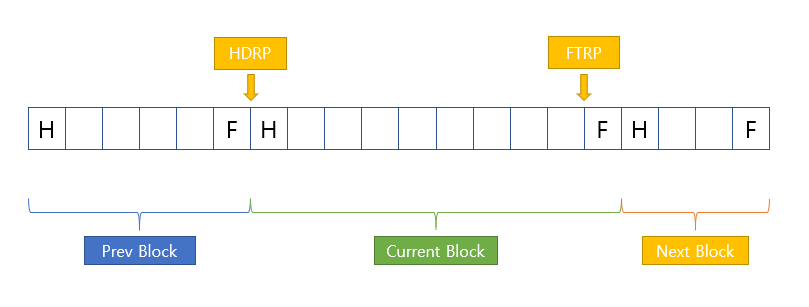 FTRP(bp) : 현재 블록의 풋터의 위치를 반환한다. ( bp + 현 블록의 크기 - 2words; bp + 현 블록의 크기하면 다음 블록의 BP를 나타낸다. 그래서 그 자리에서 -2words를 하면 현 블록의 풋터를 나타내게 된다.)