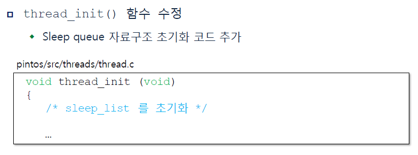 Sleep queue 자료구조를 추가해야한다. 이미 있는 ready_list와 같은 구조로 만들면 된다. 그리고 전역 변수로 next_tick_to_awake를 추가하자.
