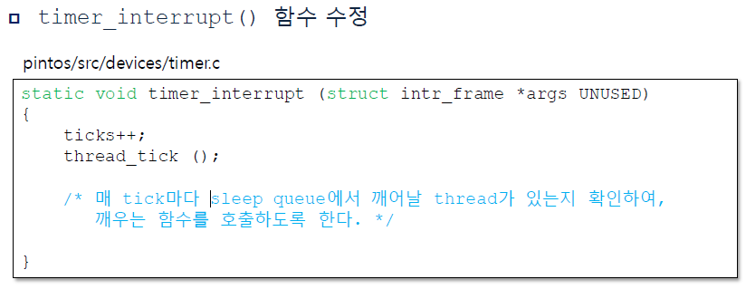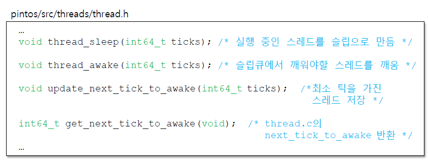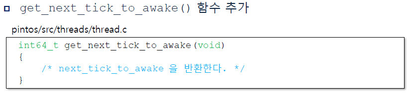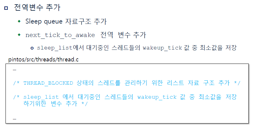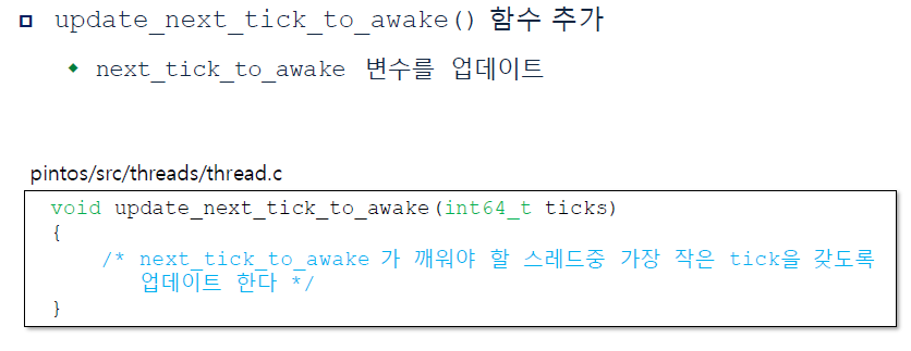 sleep_list에서 대기중이 스레드들의 wakeup_tick 값 중 최소값을 저장하는 전역 변수;next_tick_to_wake 추가한다.