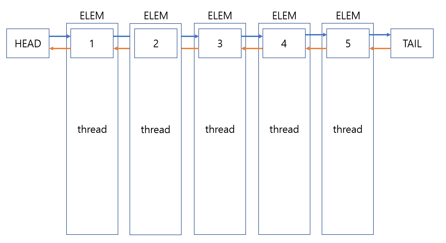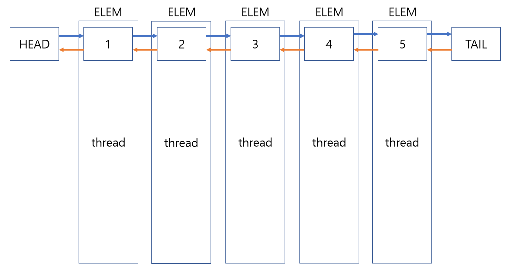 head와 tail은 list (이중연결 리스트) 를 가리키고, elem은 이 list와 thread에 동시에 소속되어있다. 이런 구조를 가짐으로서 list는 스레드가 아닌 elem만 가지고있으면서도 스레드를 찾아갈 수 있다. head와 tail은 리스트의 처음과 끝만 가리키는 역할을 할 뿐, 다른 elem처럼 스레드를 가리키고 있지 않다. (head, tail을 가지고 있으면 스레드를 가리키는 elem을 삽입/삭제할 때 예외처리를 할 필요없이 간단하게 할 수 있다.)