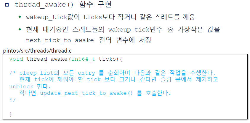 만약, thread가 일어난다면, sleep_list가 변했으므로 next_tick_to_awake가 바뀔 것이다. 그래서 현재 ticks에서 일어나지 않은 thread 중에서 가장 작은 wakeup_tick이 next_tick_to_awake가 될 것이다. 이것을 갱신해주는 것이 두번째 역할이다.