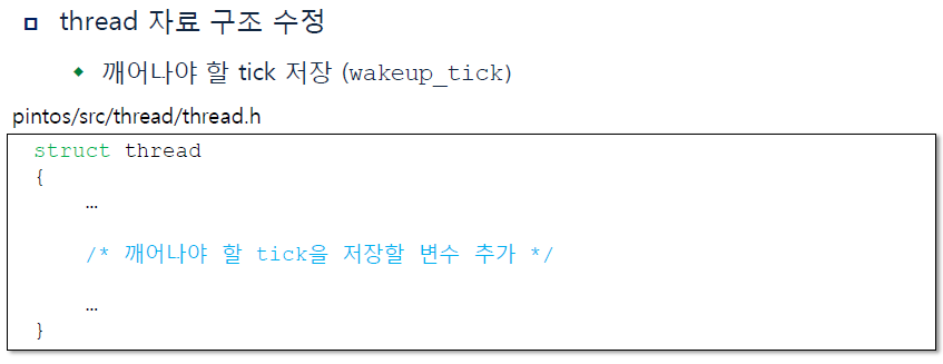 깨어나야 할 변수를 추가했다. 스레드가 sleep_list에서 대기하고 있을 때, 이 tick을 체크해서 어떤 스레드를 깨울지 결정한다.
