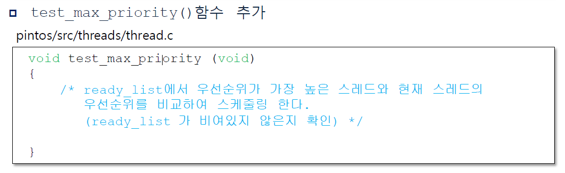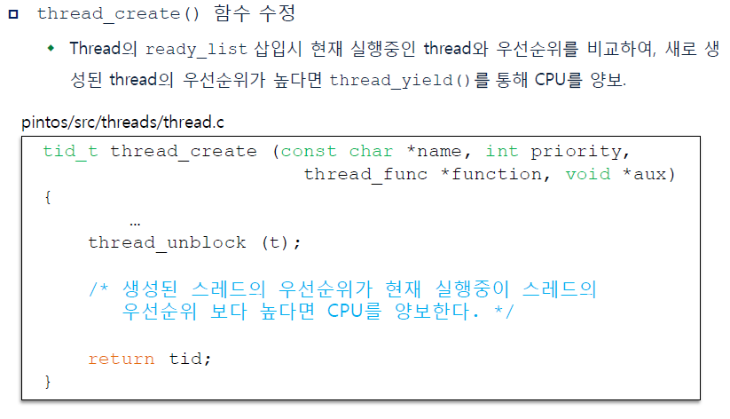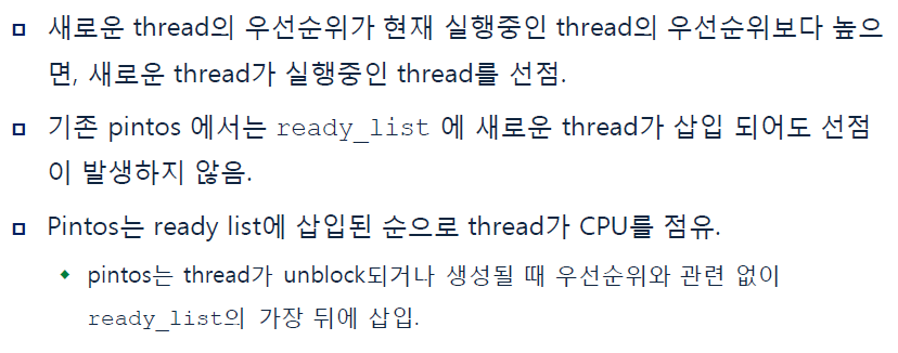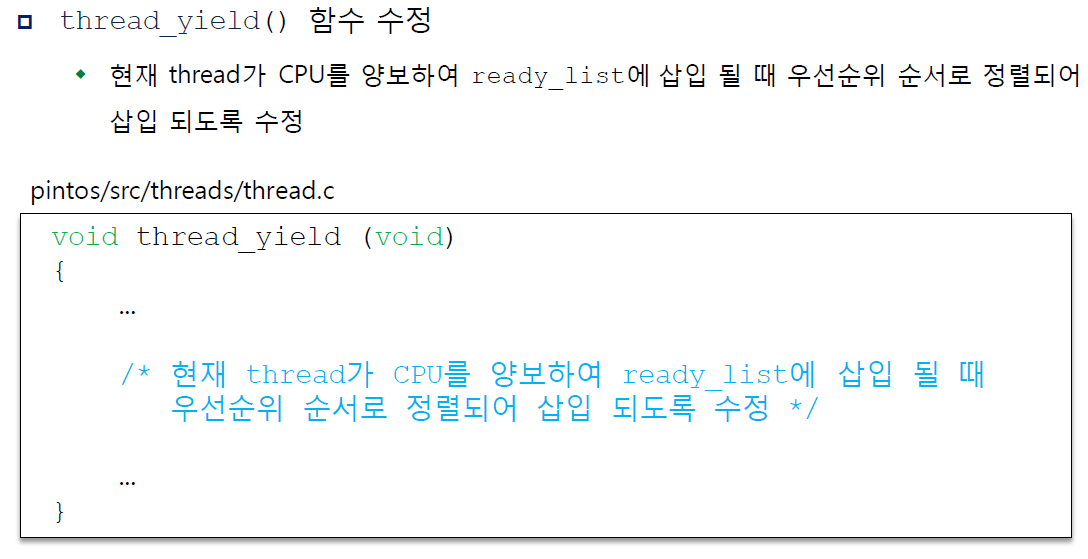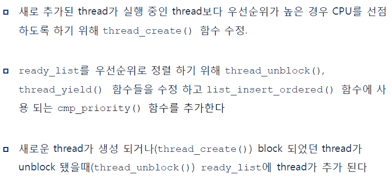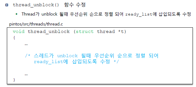 unblock과 yield할 때 수정한다는 것은, ready_list에 변화가 있을 때 우선순위별로 정렬하라는 것이다. 이는 list_insert_ordered() 로 정렬한다.