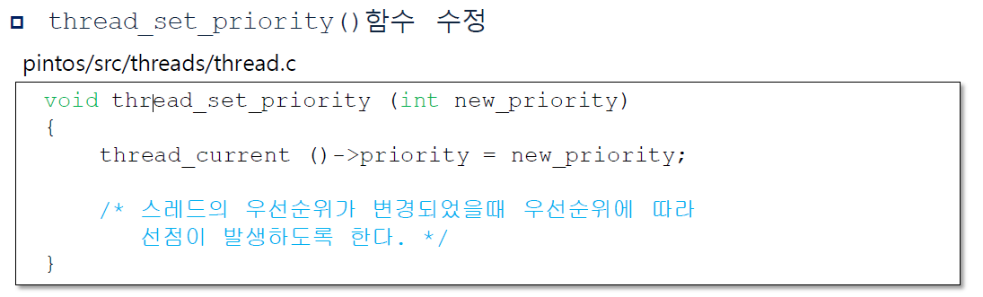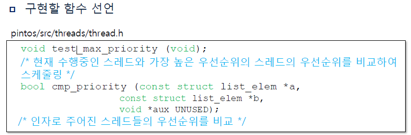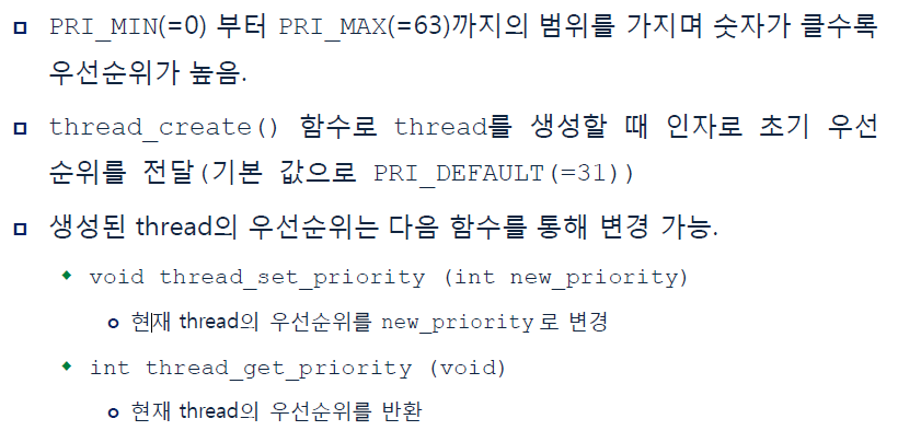 스레드 구조체에 PRI가 들어갈 것 같다. 그리고 스레드의 우선순위를 바꾸는 함수와 우선순위를 반환하는 함수가 들어간다.