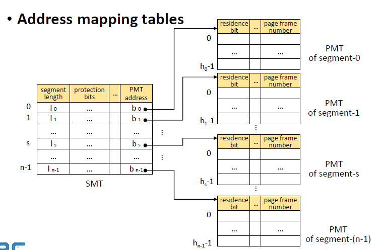 2. SMT에서 PMT address b(S)를 찾아, page number p를 활용해 page frame number p`를 알아낸다. ( b(s) + p * PMT entrySize )