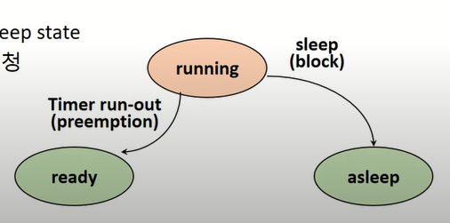- Block/sleep : 추가 자원(IO등)이 필요할 때, 자원을 할당받을 때까지 작업을 Block한 후, sleep 상태로 대기한다.