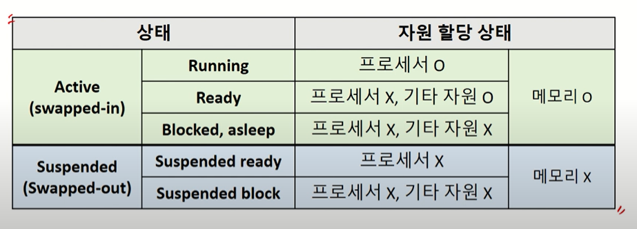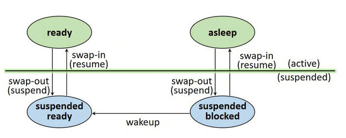 - Swap-out (suspended) : Memory image를 저장하고 메모리 할당을 반환하는 것
